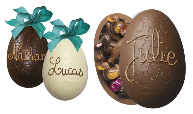 Voilà une savoureuse idée ! Faire inscrire gratuitement le prénom de son choix sur un œuf en chocolat. En plus, il est garni d’un savoureux assortiment de chocolats de Pâques ! Pour varier les plaisirs, l’œuf 13 cm existe en chocolat au lait, chocolat blanc ou chocolat noir.
